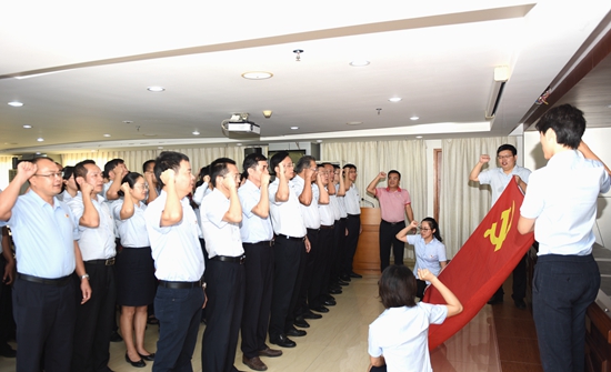 上午8時30分,宣誓儀式開始,全體黨員干部佩戴黨徽,面向黨旗莊嚴宣誓。“我宣誓:我志愿加入中國共產(chǎn)黨……對黨忠誠,積極工作,為共產(chǎn)主義奮斗終身……” 公司黨委專職副書記王修奮作為領(lǐng)誓人,右手舉拳,領(lǐng)誦誓詞,其他宣誓人列隊站立,跟誦誓詞。宣誓人員鏗鏘有力地將自己的名字鄭重落在了忠于黨,忠于人民,為共產(chǎn)主義奮斗終身的錚錚誓言上。